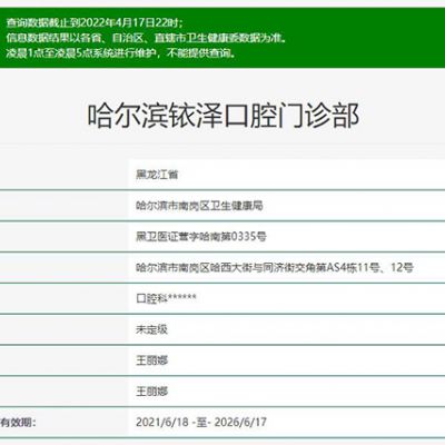 哈爾濱銥澤口腔門診部是一家通過正規(guī)機(jī)構(gòu)認(rèn)證,符合醫(yī)療機(jī)構(gòu)條件的口腔,以下是通過236z.com了解到的一些信息。哈爾濱銥澤口腔認(rèn)證信息查詢?nèi)缦拢菏》荩汉邶埥?..