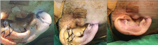 對(duì)耳垂缺損部分作V形切開進(jìn)行直接拉攏縫合,或?qū)⒍惯吘壠つw切開,各設(shè)計(jì)兩個(gè)“Z”臂并切開,角瓣左右交換位置縫合后,前后皮膚分別縫合